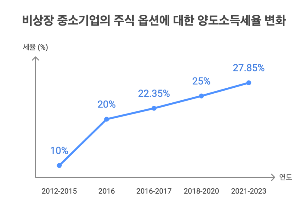 2012년 4월 15일부터 비상장 중소기업에 풀어주었던 자기주식권은 2012년부터 2015년까지 양도소득세 10%가 부과되었습니다. 그러나 2016년부터는 양도차익에 따라 20% 또는 25%의 세금이 부과되며, 지방세와 증권거래세를 포함하면 총 세금이 22.35%에서 27.85%로 증가합니다.