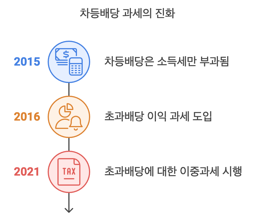 차등배당은 2015년까지 소득세만 부과되었으나, 2016년부터는 본인의 지분율을 초과하여 받는 부분에 대해 초과배당 이익으로 간주되어 소득세와 증여세가 부과되었습니다. 2021년부터는 초과 배당 받은 금액에 대해 소득세를 먼저 내고, 그 후 남은 금액에 대해 증여세가 부과되는 이중과세로 변경되었습니다. 이로 인해 2015년까지 차등배당을 받았던 금액에 비해 현재는 세금이 2배 이상 증가할 것으로 예상됩니다.
